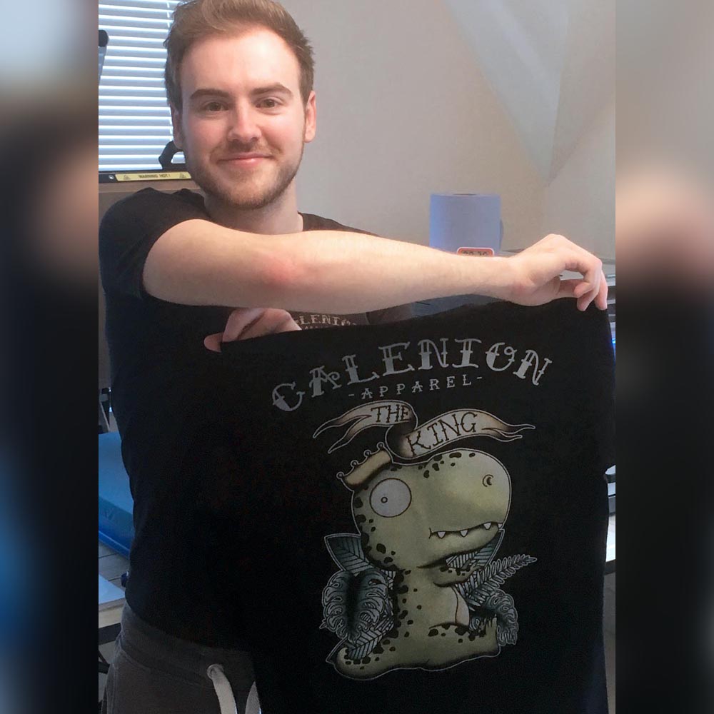 Hi! I'm Tom, the owner of Calenion Apparel. This is me after printing one of the first ever orders I received back in 2020, whilst set up in a spare bedroom.