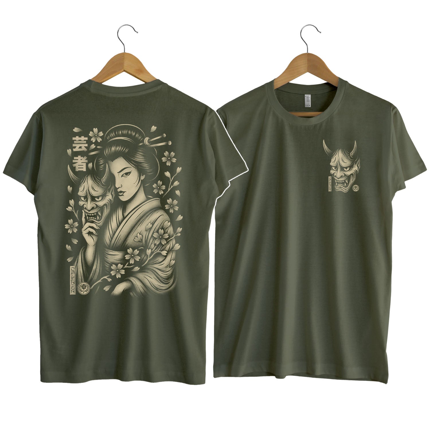 A graceful geisha and a menacing hannya mask. Together, they reflect the duality of emotion behind a painted smile.