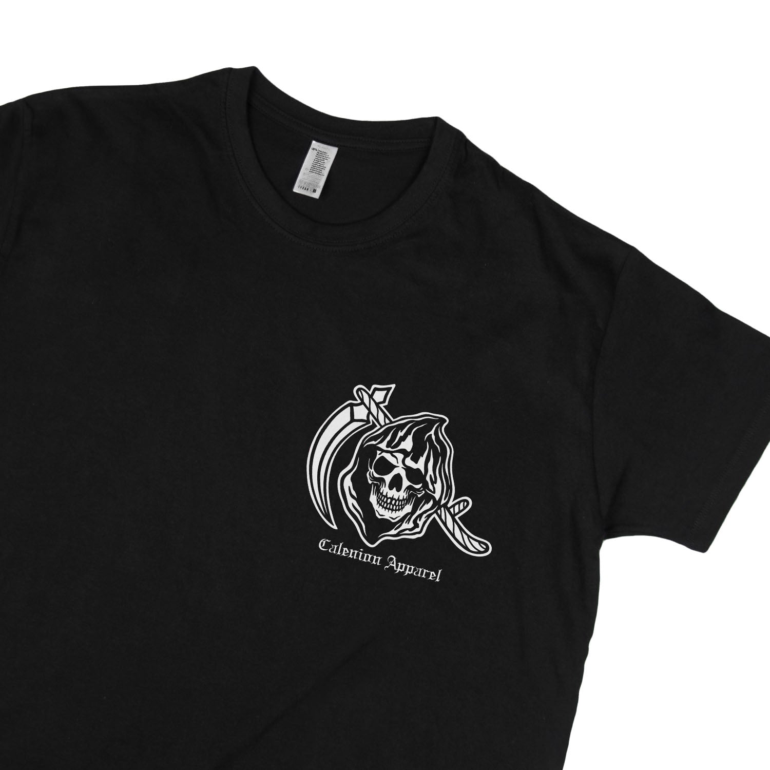A pocket print design featuring a hooded grim reaper with a scythe.
