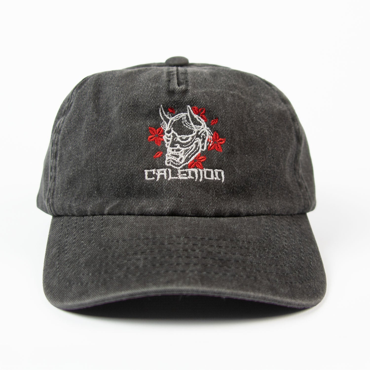 Vintage wash style 5-panel cap with a soft unstructured crown. Featuring a Hannya embroidered design on the front panel.